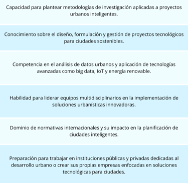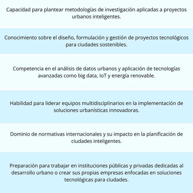 Formar especialistas en el desarrollo e implementación de proyectos para ciudades inteligentes, integrando conocimientos técnicos, administrativos y estratégicos.