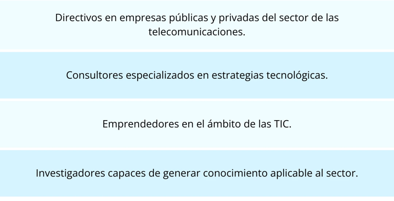 A través de una visión global y actualizada del sector de las telecomunicaciones, los estudiantes adquirirán herramientas avanzadas para liderar empresas e instituciones en un entorno competitivo y en constante evolución, contribuyendo al desarrollo sostenible del país y la región.