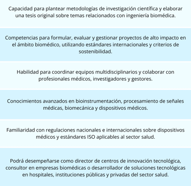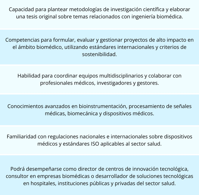 Formar profesionales competentes capaces de liderar proyectos de investigación e innovación en el campo de la ingeniería biomédica.